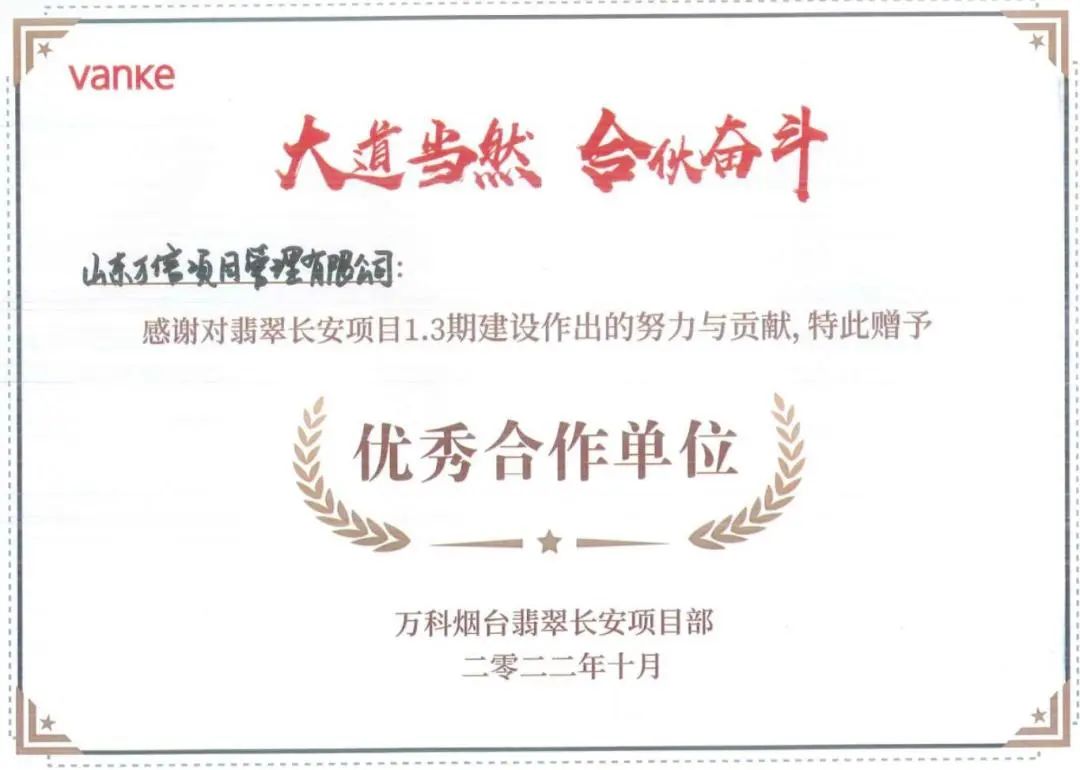 凝聚産(chǎn)生力量,團結誕(dàn)生希望。在2022年工作中,萬信咨詢與萬科翡翠長(zhǎng)安項目部、萬科城市之光住宅項目部通力合作,雙雙榮獲“優秀合作單(dān)位”及“交叉互檢安全優勝獎”。