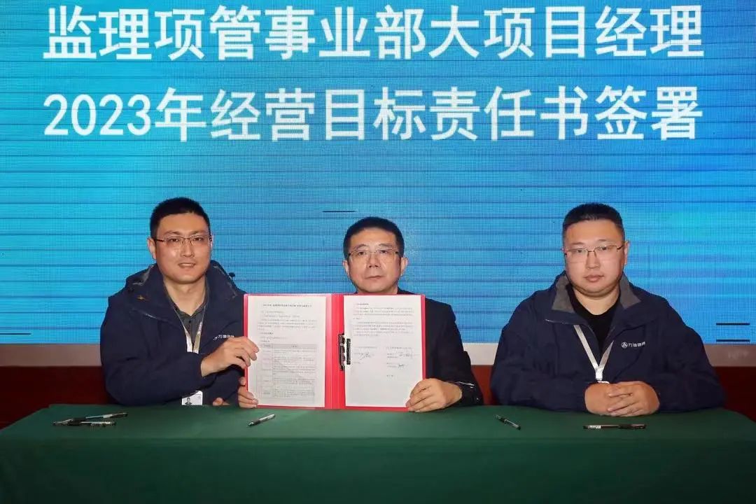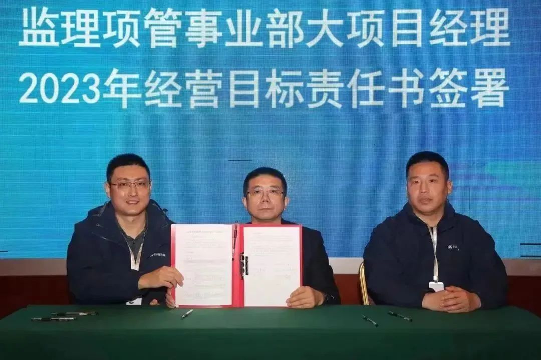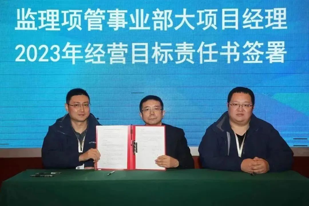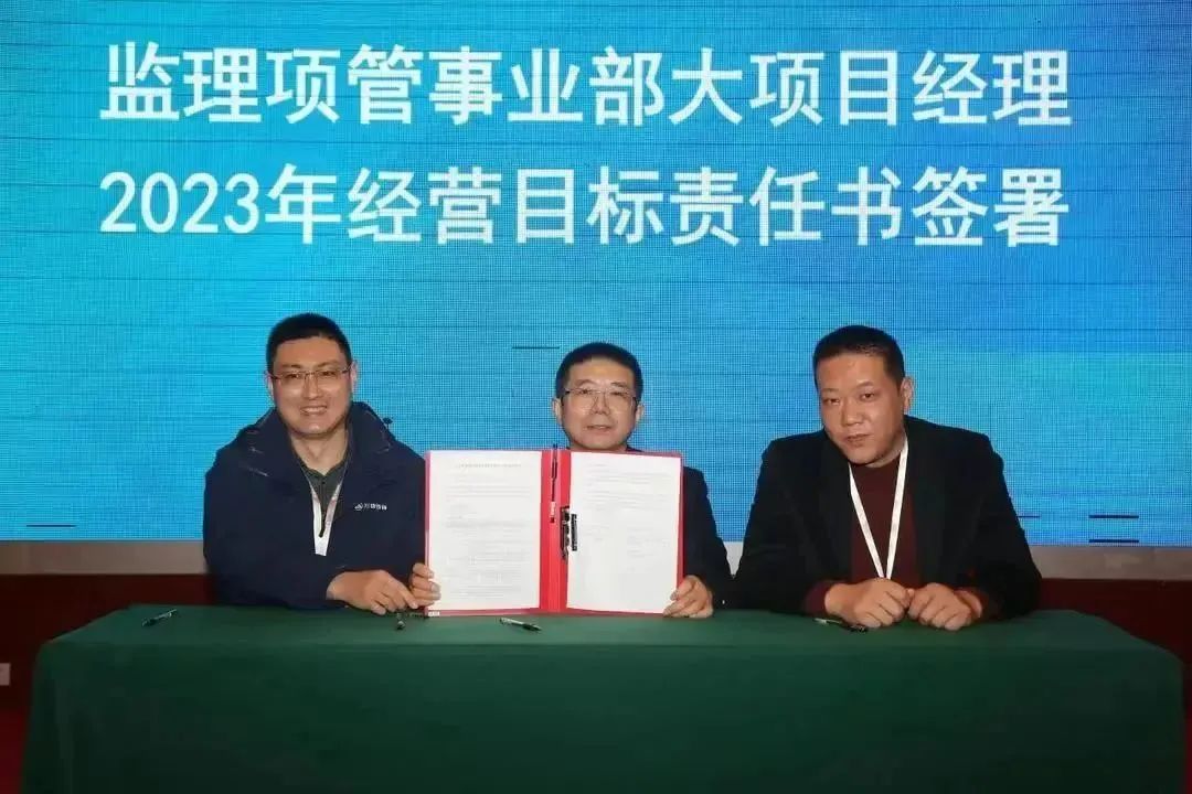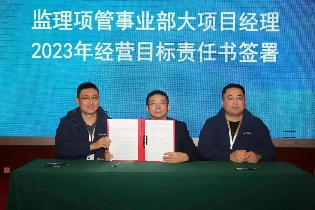 爲瞭更好地貫徹公司戰略,激勵各團隊上下同心、努力拼搏,圓滿完成各項經營指标,董事長與市場及各執業部門負責人、監(jiān)理項管事業部大項目經(jīng)理簽署《2023年度經營目标責任書》,現場氣氛莊重而熱烈。