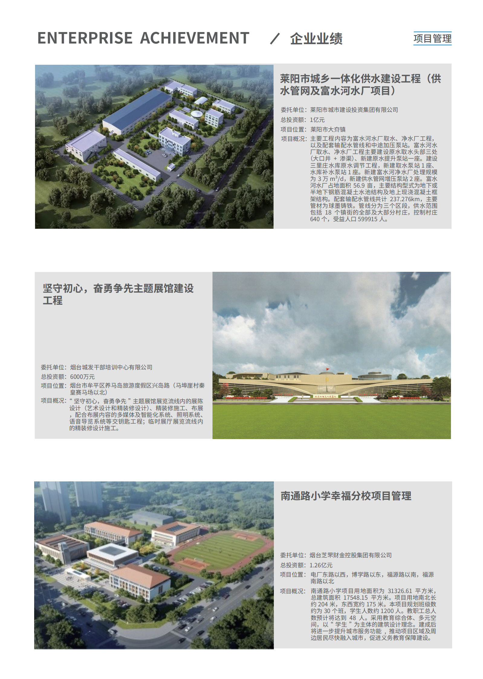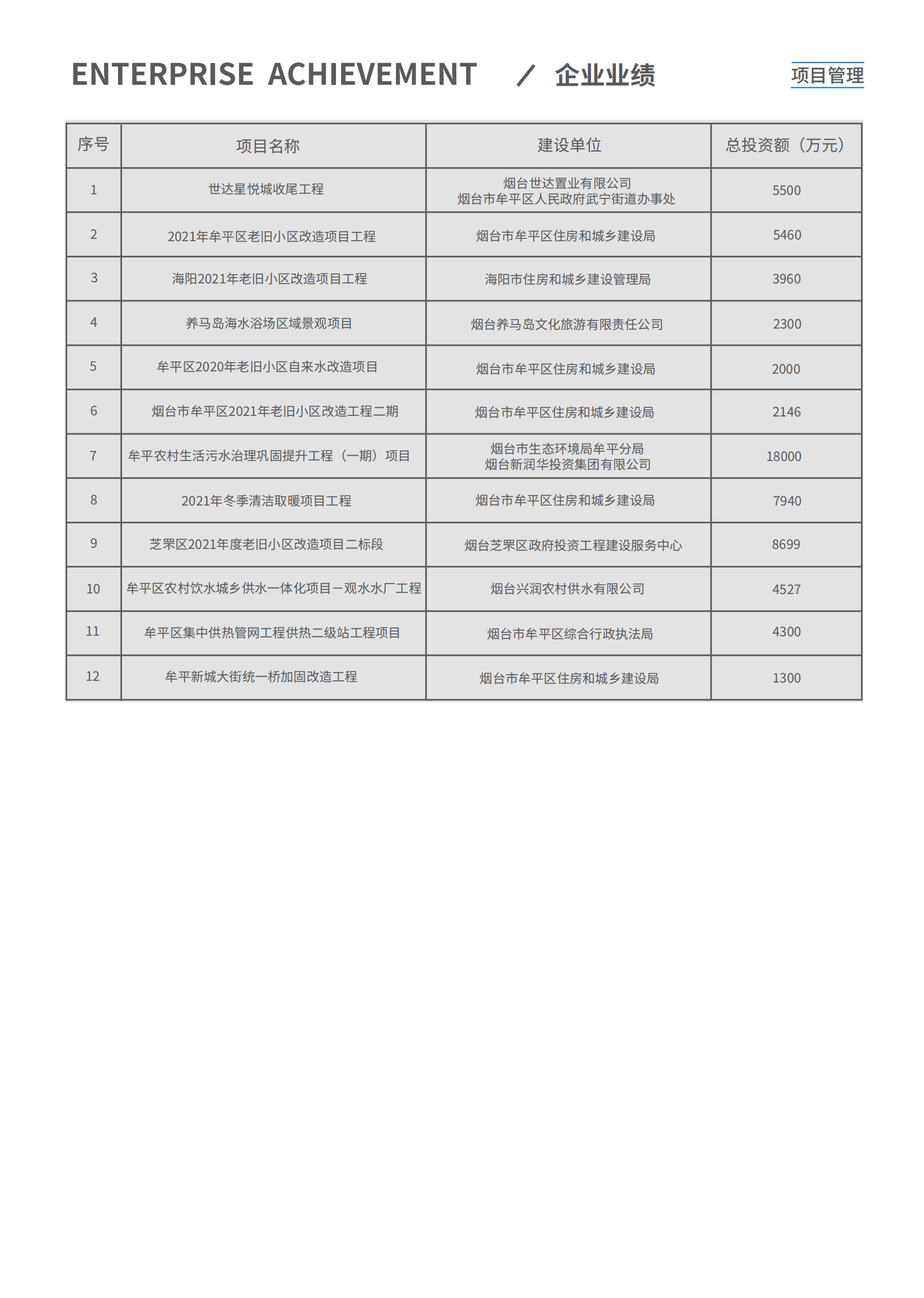 公司業務不斷拓展和延伸,主營業務成績斐然。先後與中海集團、中鐵集團、金地集團、保利集團、萬科集團、萬達集團、聯想集團、綠城集團、大連海昌集團、煙台城投、高新區城投、煙台城發集團、煙台藍天投資、青島城投等國内大型開發集團;濱州醫學院、煙台市中醫醫院、煙台市傳染病醫院、萊陽中心醫院、蓬萊市中醫院、山東省立醫院、濟南千佛山醫院等大型醫療機構;煙台大學、魯東大學、中國農業大學、山東工商學院等高等學府;中國銀行、大唐桂冠、青島能源集團、青島地鐵集團、青島水務集團、恒邦集團、煙台泰和新材料、煙台萬華、煙台萬潤、中集來福士、玲珑集團、招金集團、中礦金業、振華集團、佳隆集團、清泉集團等大型企業集團以及煙台市、濟南市、青島市、濰坊市等政府採(cǎi)購部門建立瞭(le)長期穩定的合作關系,成功完成瞭(le)包括建築、市政、交通、冶煉、輕紡、化工、醫療等項目各類服務。