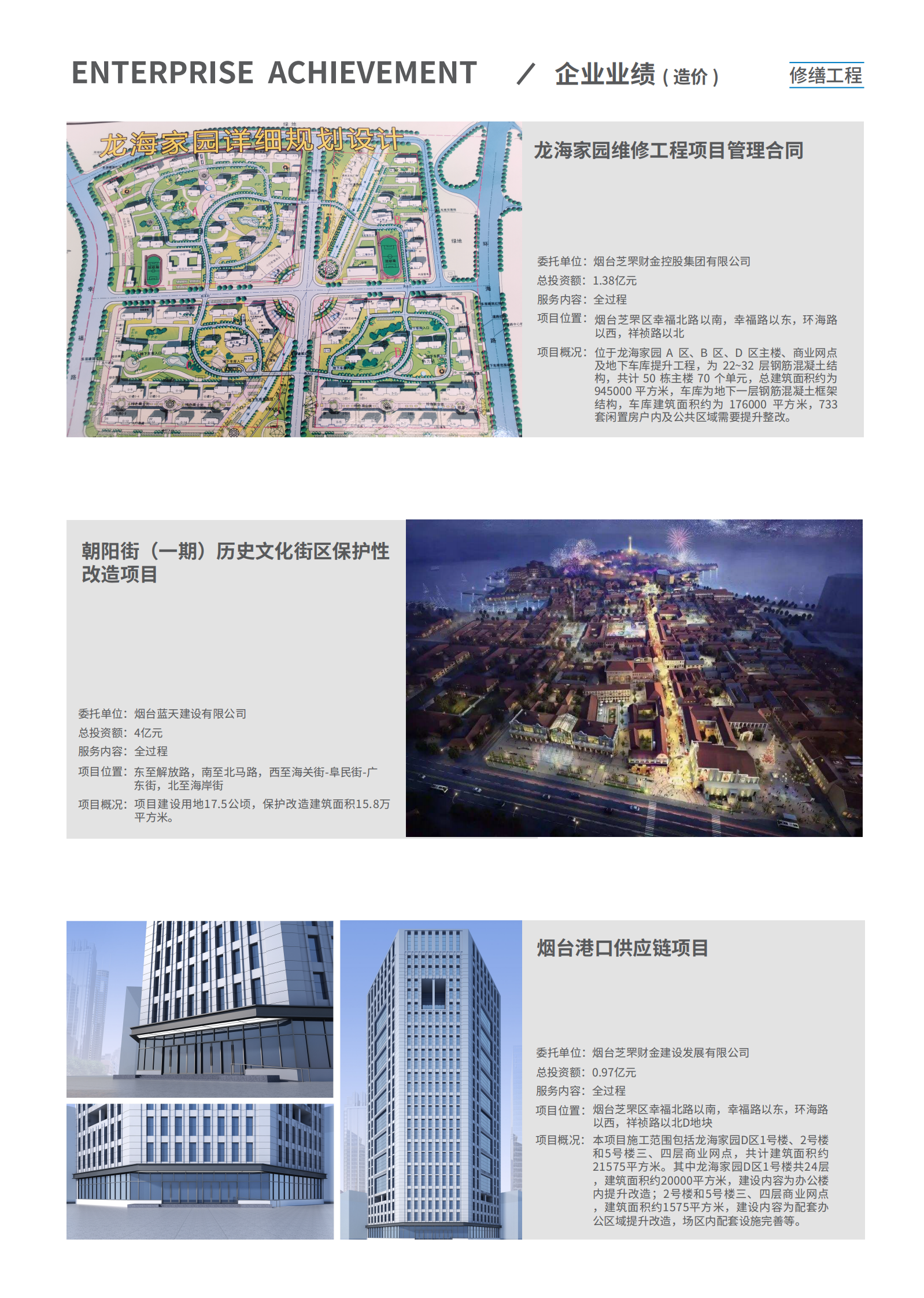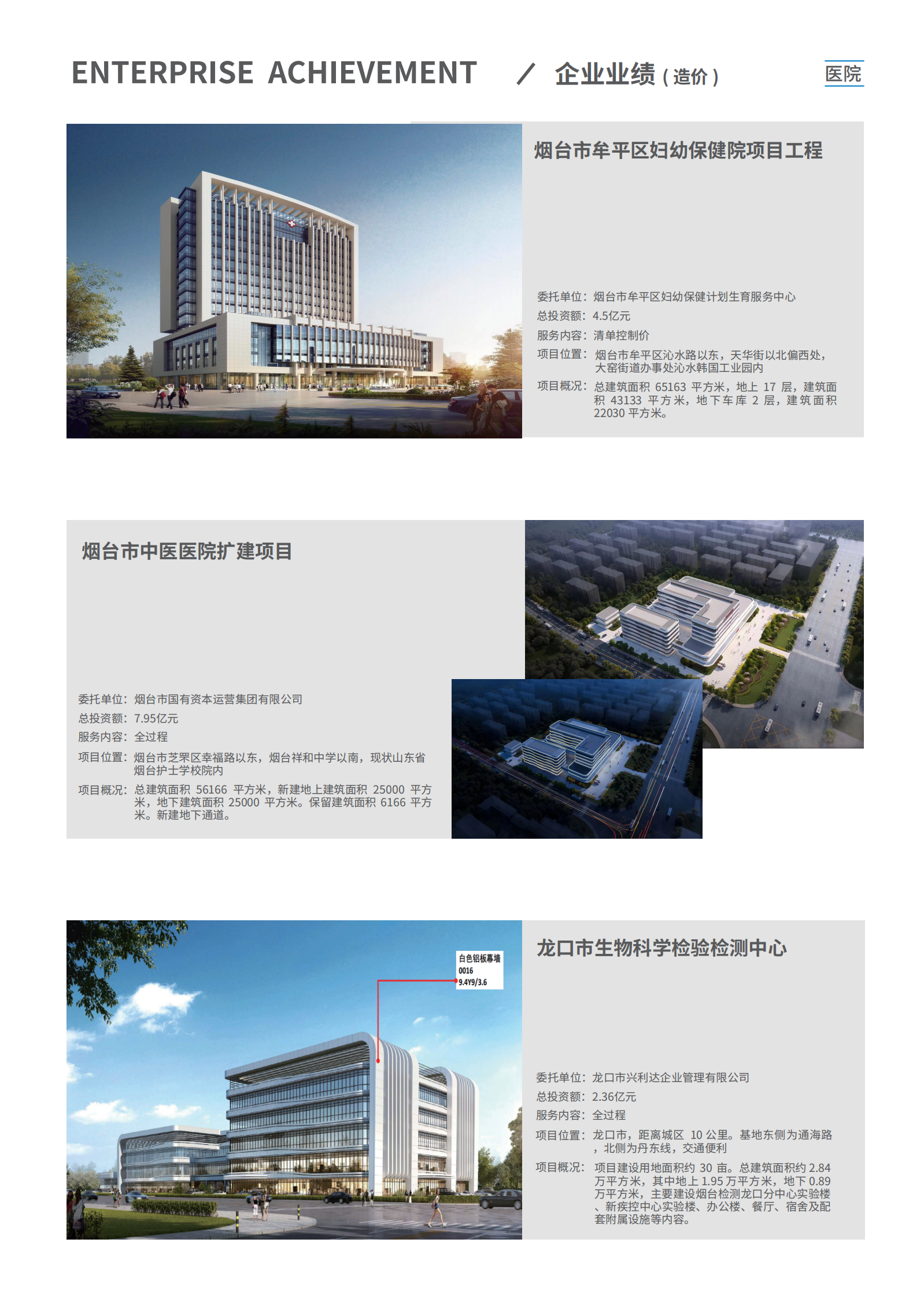公司業務不斷拓展和延伸,主營業務成績斐然。先後與中海集團、中鐵集團、金地集團、保利集團、萬科集團、萬達集團、聯想集團、綠城集團、大連海昌集團、煙台城投、高新區城投、煙台城發集團、煙台藍天投資、青島城投等國内大型開發集團;濱州醫學院、煙台市中醫醫院、煙台市傳染病醫院、萊陽中心醫院、蓬萊市中醫院、山東省立醫院、濟南千佛山醫院等大型醫療機構;煙台大學、魯東大學、中國農業大學、山東工商學院等高等學府;中國銀行、大唐桂冠、青島能源集團、青島地鐵集團、青島水務集團、恒邦集團、煙台泰和新材料、煙台萬華、煙台萬潤、中集來福士、玲珑集團、招金集團、中礦金業、振華集團、佳隆集團、清泉集團等大型企業集團以及煙台市、濟南市、青島市、濰坊市等政府採(cǎi)購部門建立瞭(le)長期穩定的合作關系,成功完成瞭(le)包括建築、市政、交通、冶煉、輕紡、化工、醫療等項目各類服務。